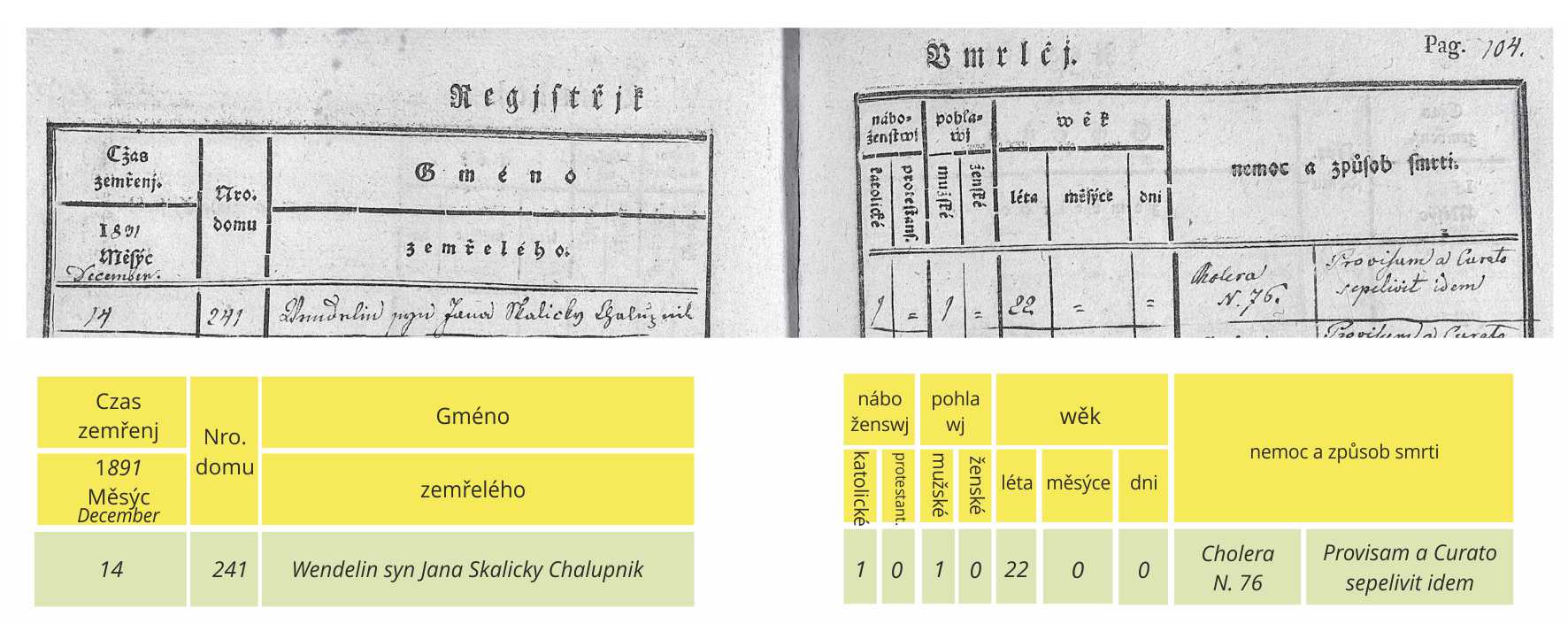Úmrtní záznamy bývají nejstručnější, od r. 1714 je povinná lékařská prohlídka zemřelého, tudíž se dozvíme i příčinu úmrtí (pokud se ji podařilo zjistit). Nejdůležitější je jméno, jméno otce a adresa, podle kterých můžeme správně identifikovat hledanou osobu. Věk se počítal na měsíce a dny obvykle jen u dětí mladších jednoho roku. Číslo 76 udává kolikátý smrtelný případ cholery to v dané farnosti byl.