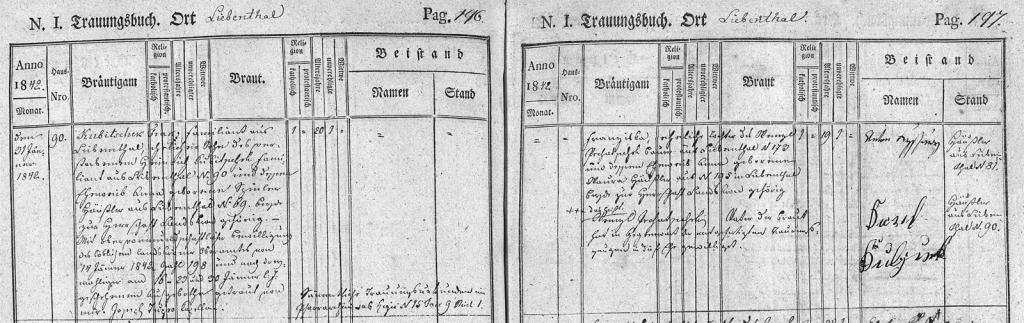 Praxe byla často taková, že ten kdo zapisoval do matriky, využil jednu celou stranu pouze pro ženicha a druhou (stejný tiskopis) pro nevěstu, takže text běžel volně přes hranice buněk.